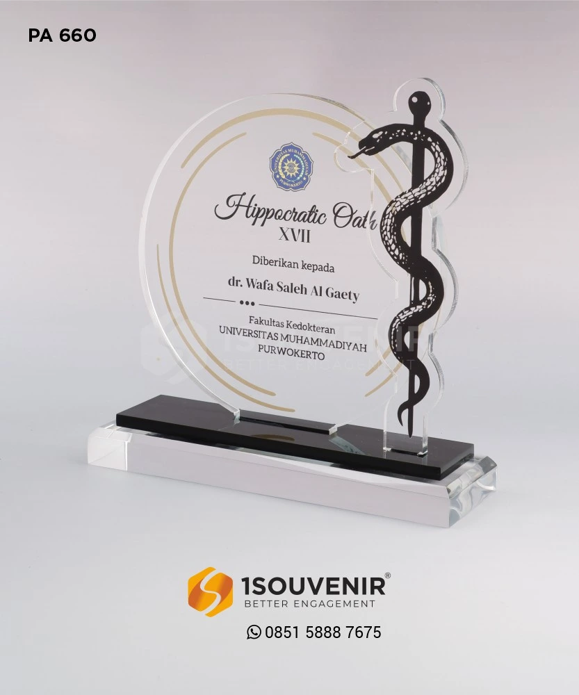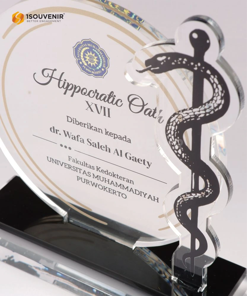 Plakat Hippocratic Oath XVII ini dibuat dari bahan akrilik premium dengan desain simbol tongkat Asklepios yang ikonik. Transparansi akriliknya memberi kesan modern dan profesional, cocok untuk penghargaan akademik berkelas.